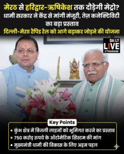 рдЙрддреНрддрд░ рднрд╛рд░рдд рдХреЗ рдпрд╛рддреНрд░рд┐рдпреЛрдВ рдФрд░ рдХрд╛рдВрд╡рдбрд╝рд┐рдпреЛрдВ рдХреЗ рд▓рд┐рдП рдмрдбрд╝реА рдЦрдмрд░ рд╕рд╛рдордиреЗ рдЖ рд░рд╣реА рд╣реИред рдЙрддреНрддрд░рд╛рдЦрдВрдб рд╕рд░рдХрд╛рд░ рдиреЗ рдореЗрд░рда рд╕реЗ рд╣рд░рд┐рджреНрд╡рд╛рд░ рдФрд░ рдЛрд╖рд┐рдХреЗрд╢ рддрдХ рдЖрдзреБрдирд┐рдХ рд░реЗрд▓ рдХрдиреЗрдХреНрдЯрд┐рд╡рд┐рдЯреА рдмрдврд╝рд╛рдиреЗ рдХрд╛ рдмрдбрд╝рд╛ рдкреНрд░рд╕реНрддрд╛рд╡ рд░рдЦрд╛ рд╣реИред рдпрд╣ рдЪрд░реНрдЪрд╛ рдЗрд╕рд▓рд┐рдП рддреЗрдЬ рд╣реБрдИ рд╣реИ рдХреНрдпреЛрдВрдХрд┐ рдореБрдЦреНрдпрдордВрддреНрд░реА Pushkar Singh Dhami рдиреЗ рдХреЗрдВрджреНрд░ рд╕рд░рдХрд╛рд░ рд╕реЗ рдЗрд╕ рд░реВрдЯ рдкрд░ рд░реИрдкрд┐рдб рд░реЗрд▓/рдореЗрдЯреНрд░реЛ рдЬреИрд╕реА рддреЗрдЬрд╝ рд╕реЗрд╡рд╛ рдХреЗ рд╡рд┐рд╕реНрддрд╛рд░ рдХреА рдорд╛рдВрдЧ рдХреА рд╣реИред
