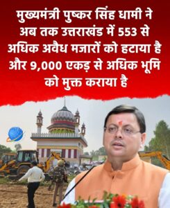 उत्तराखंड में मुख्यमंत्री पुष्कर सिंह धामी के नेतृत्व में चल रहा अवैध कब्ज़ों और धार्मिक अतिक्रमणों के खिलाफ अभियान अब निर्णायक चरण में पहुंच चुका है। सरकार की सख्त नीति के तहत अब तक प्रदेशभर में 553 से अधिक अवैध मज़ारों को हटाया गया है और 9,000 एकड़ से ज़्यादा भूमि को अतिक्रमण मुक्त कराया गया है।