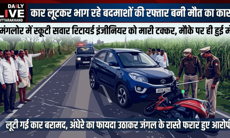 हरिद्वार जनपद के मंगलौर क्षेत्र में शनिवार शाम एक सनसनीखेज वारदात ने पूरे इलाके को झकझोर कर रख दिया। कार लूटकर भाग रहे तीन बदमाशों ने तेज रफ्तार में एक स्कूटी सवार को जोरदार टक्कर मार दी, जिससे उसकी मौके पर ही दर्दनाक मौत हो गई। मृतक की पहचान 65 वर्षीय अनिल त्यागी के रूप में हुई है, जो सिंचाई विभाग से रिटायर्ड इंजीनियर थे।