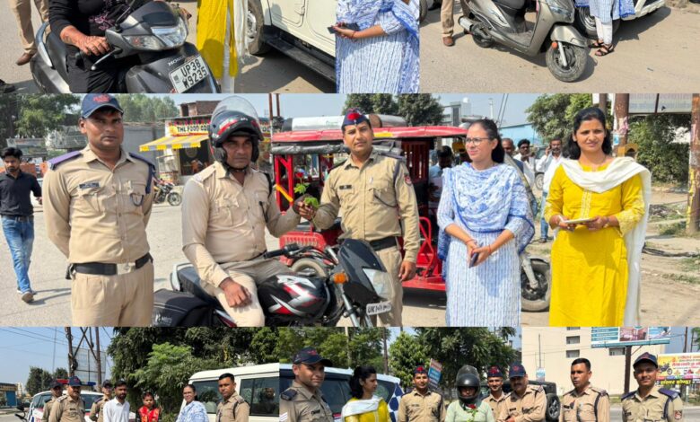 डीएम मयूर दीक्षित के आदेश पर चला विशेष अभियान,, हेलमेट वालों को फूल, नियम तोड़ने वालों पर चालान त्योहारों में सुरक्षा का संदेश — परिवहन विभाग का अनोखा अभियान हरिद्वार में शुरू,, एआरटीओ नेहा झा और TTO वरुणा सैनी के नेतृत्व में “फूल और चालान” से दी सड़क सुरक्षा की सीख