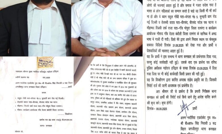 हरिद्वार। प्रधानमंत्री नरेंद्र मोदी की माता स्वर्गीय हीराबेन मोदी के खिलाफ बिहार के दरभंगा में हुए कथित अपमानजनक बयान को लेकर हरिद्वार कोर्ट में बड़ा कानूनी कदम उठाया गया है। अधिवक्ता अरुण भदोरिया ने अपने वकील कमल भदोरिया के माध्यम से सीजीएम कोर्ट हरिद्वार में कांग्रेस नेता राहुल गांधी, राजद नेता तेजस्वी यादव, मोहम्मद रिजवी उर्फ राजा और कार्यक्रम आयोजक नौशाद के खिलाफ धारा 156(3) सीआरपीसी एवं नई धारा 175(3) बीएनएस के तहत मुकदमा दर्ज करने के लिए अर्जी दायर की।
