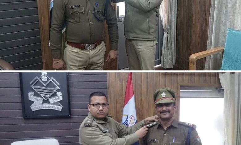 जनपद चमोली में नियुक्त उ0नि0 अनुरोध व्यास का उप निरीक्षक नागरिक पुलिस से निरीक्षक नागरिक पुलिस के पद पर पदोन्नति होने पर पुलिस अधीक्षक चमोली श्री सर्वेश पंवार द्वारा उन्हें निरीक्षक पद के अलंकरण से अलंकृत कर उज्जवल भविष्य के लिए शुभकामनाएं दी गई।
