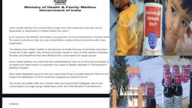 ⚫ बच्चों की ज़िंदगी से खिलवाड़ नहीं चलेगा!,, कफ सिरप से मौतें बनी राष्ट्रीय चिंता — केन्द्र सरकार सख्त, दो राज्यों में हड़कंप,, स्वास्थ्य मंत्रालय की एडवाइजरी जारी — दो साल से कम उम्र के बच्चों को न दी जाए कोई कफ-कोल्ड दवा,, बच्चों की मौतों से मचा हड़कंप — स्वास्थ्य मंत्रालय की आपात एडवाइजरी