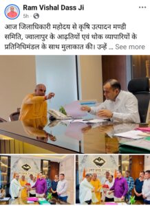 ज्वालापुर कृषि उत्पादन मंडी समिति से जुड़े आढ़तियों और थोक व्यापारियों का एक बड़ा दल सोमवार को जिलाधिकारी मयूर दीक्षित से मिला। देवभूमि सब्जी फल विक्रेता आढ़ती एसोसिएशन के अध्यक्ष तीर्थाचार्य राम विशाल दास महाराज के नेतृत्व में पहुंचे प्रतिनिधिमंडल ने मंडी क्षेत्र से जुड़ी कई गंभीर समस्याएं विस्तार से जिलाधिकारी के सामने रखीं।