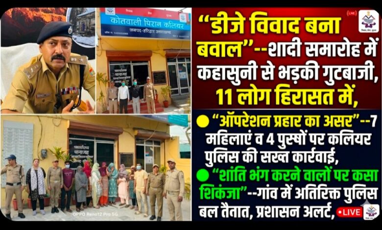 जनपद हरिद्वार के कोतवाली पिरान कलियर क्षेत्र अंतर्गत ग्राम महमूदपुर कलियर में शादी समारोह के दौरान डीजे बजाने को लेकर शुरू हुआ मामूली विवाद देखते ही देखते गुटबाजी में बदल गया। हालात बिगड़ते देख पुलिस ने तत्काल हस्तक्षेप करते हुए “ऑपरेशन प्रहार” के तहत सख्त कार्रवाई की और शांति व्यवस्था भंग करने के आरोप में कुल 11 लोगों को हिरासत में लिया।