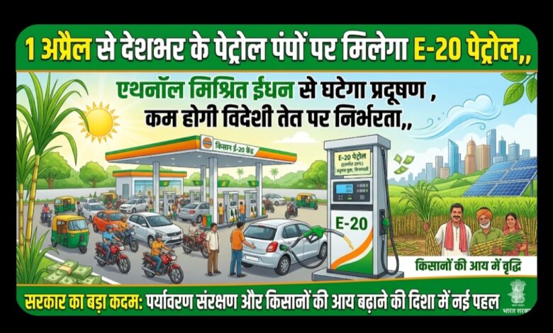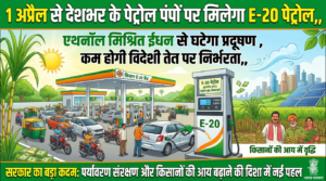 1 अप्रैल से देशभर के पेट्रोल पंपों पर मिलेगा E-20 पेट्रोल,, एथनॉल मिश्रित ईंधन से घटेगा प्रदूषण, कम होगी विदेशी तेल पर निर्भरता,, सरकार का बड़ा कदम: पर्यावरण संरक्षण और किसानों की आय बढ़ाने की दिशा में नई पहल