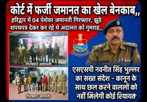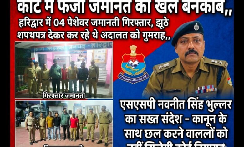 कोर्ट में फर्जी जमानत का खेल बेनकाब,, हरिद्वार में 04 पेशेवर जमानती गिरफ्तार, झूठे शपथपत्र देकर कर रहे थे अदालत को गुमराह,, एसएसपी नवनीत सिंह भुल्लर का सख्त संदेश – कानून के साथ छल करने वालों को नहीं मिलेगी कोई रियायत