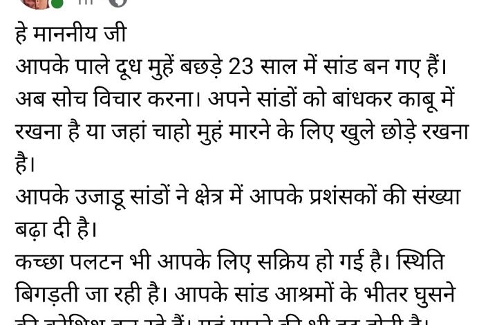 क्षेत्र की सियासी और सामाजिक गतिविधियों में एक नया विवाद चर्चा का विषय बना हुआ है। आरोप है कि जिन “दूधमुंहे बछड़ों” को संरक्षण और परवरिश मिली थी, वे अब 23 साल में “सांड” बनकर बेलगाम घूम रहे हैं। इन सांडों पर काबू पाना या इन्हें खुला छोड़ना, अब पालने वालों के सामने सबसे बड़ा सवाल बन गया है।