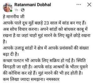 आश्रमों तक पहुंचने लगे बेलगाम सांड, स्थिति गंभीर,, वरिष्ठ पत्रकार रत्नमणि डोभाल ने फेसबुक पर साझा की जिज्ञासा