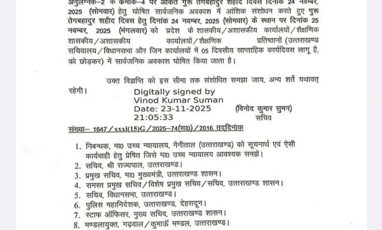 उत्तराखण्ड शासन ने बताया है कि राज्य में प्रत्येक वर्ष 24 नवम्बर (सोमवार) को घोषित सार्वजनिक अवकाश में इस वर्ष आंशिक संशोधन किया गया है। गृह विभाग द्वारा जारी आदेश (संख्या 1647/xxxi(15)G/2025-74(सा०)/2016, दिनांक 23 नवम्बर 2025) के अनुसार, 24 नवम्बर 2025 को निर्धारित सार्वजनिक अवकाश को 25 नवम्बर 2025 (मंगलवार) को कर दिया गया है।