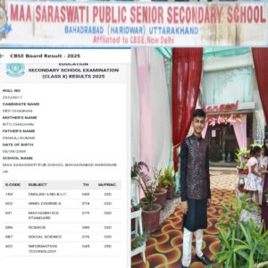 मां सरस्वती पब्लिक सीनियर सेकेंडरी स्कूल बहादराबाद के होनहारों ने लहराया परचम, सीबीएसई 2024 परीक्षा में करीब शत-प्रतिशत परिणाम, देव चौहान बना टॉपर, हासिल किए 96.8 फीसदी अंक