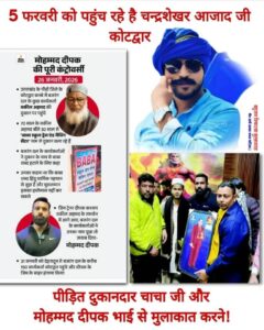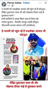 कोटद्वार में नगीना सांसद चन्द्रशेखर आजाद का दौरा 05 फरवरी तय,, पीड़ित दुकानदार और मोहम्मद दीपक से करेंगे मुलाकात,, न.प.रामपुर चेयरमैन परवेज सुल्तान ने अपने फेसबुक अकाउंट से सोशल मीडिया पोस्ट कर दी जानकारी