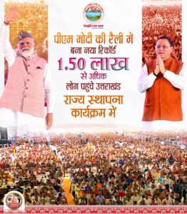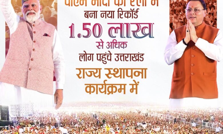 उत्तराखंड राज्य स्थापना कार्यक्रम में उमड़ा जनसैलाब,, 1.50 लाख से अधिक लोग पीएम नरेंद्र मोदी को सुनने पहुंचे, पीएम ने दी 8000 करोड़ की सौगात