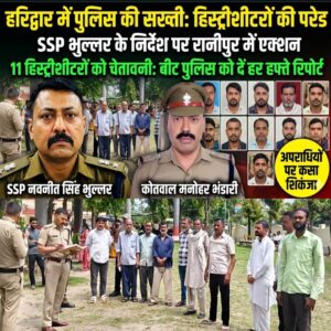 हरिद्वार में पुलिस की सख्ती—हिस्ट्रीशीटरों पर कसा शिकंजा, रानीपुर में कराई गई परेड,, 🟡 SSP नवनीत सिंह भुल्लर के निर्देश पर कोतवाल मनोहर भंडारी का एक्शन, 11 हिस्ट्रीशीटरों की गतिविधियों की समीक्षा,, 🟢 अपराध से दूर रहने की चेतावनी, हर सप्ताह बीट पुलिस को देनी होगी जानकारी
