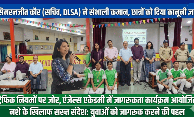 नशे के खिलाफ सख्त संदेश: युवाओं को जागरूक करने की पहल,, 🔵 सिमरनजीत कौर (सचिवDLSA)ने संभाली कमान, छात्रों को दिया कानूनी ज्ञान,, 🟢 ट्रैफिक नियमों पर जोर, एंजेल्स एकेडमी में जागरूकता कार्यक्रम आयोजित