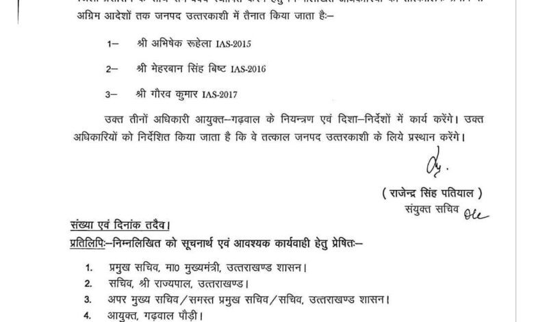 उत्तरकाशी में बाढ़ राहत कार्यों के लिए तीन IAS अधिकारियों की तैनाती, शासन ने जारी किए आदेश।