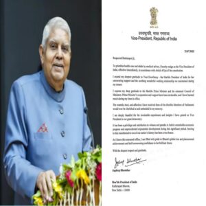 इन्तजार रजा हरिद्वार- उपराष्ट्रपति जगदीप धनखड़ ने स्वास्थ्य कारणों का हवाला देकर दिया इस्तीफा