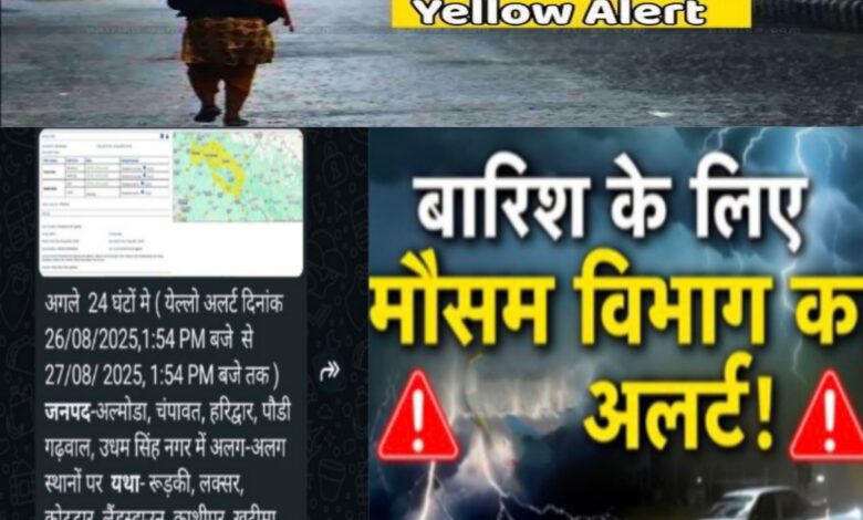 मौसम विभाग ने उत्तराखंड के पांच जिलों के लिए अगले 24 घंटों में येलो अलर्ट जारी किया है। 26 अगस्त 2025 को दोपहर 1:54 बजे से लेकर 27 अगस्त 2025 को दोपहर 1:54 बजे तक अल्मोड़ा, चंपावत, हरिद्वार, पौड़ी गढ़वाल और उधम सिंह नगर में अलग-अलग स्थानों पर भारी से बहुत भारी बारिश, गरज-चमक और तेज हवाओं के साथ बिजली गिरने की आशंका जताई गई है। इस अलर्ट के बाद संबंधित जिलों के प्रशासन ने स्थानीय लोगों से सतर्कता बरतने की अपील की है।