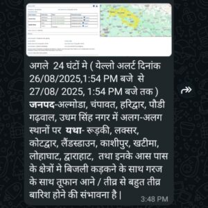 गरज-चमक और तूफान का खतरा: मौसम विभाग ने जारी किया येलो अलर्ट,, अगले 24 घंटे अलर्ट पर रहेंगे अल्मोड़ा, हरिद्वार, पौड़ी, चंपावत और उधम सिंह नगर,, भारी बारिश व बिजली गिरने की आशंका, प्रशासन ने दी सतर्कता बरतने की अपील