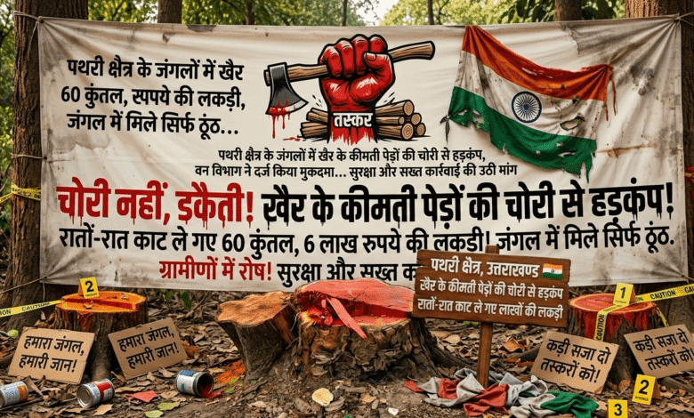 पथरी क्षैत्र के जंगलों में खैर के कीमती पेड़ों की चोरी से हड़कंप,, बीते दिनों रातों-रात काट ले गए लाखों की लकड़ी, जंगल में मिले सिर्फ ठूंठ वन विभाग ने दर्ज किया मुकदमा, ग्रामीणों में रोष – सुरक्षा और सख्त कार्रवाई की उठी मांग,, तस्करों ने खैर के लगभग 3 से 4 बड़े पेड़ों को काटा, जिनका अनुमानित वजन करीब 50 से 60 कुंतल बताया जा रहाइनकी कीमत करीब 5 से 6 लाख रुपये आंकी जा रही