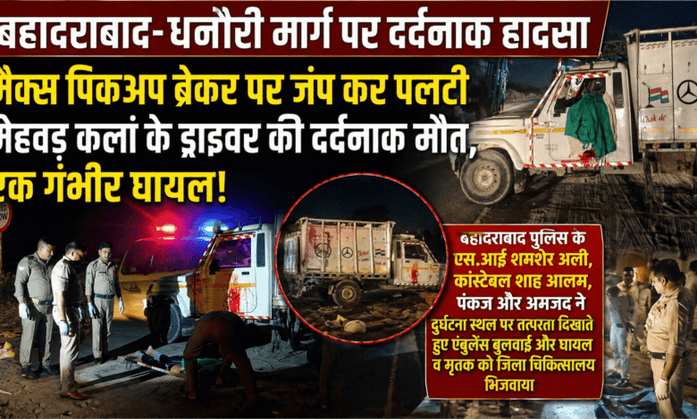 बहादराबाद-धनौरी मार्ग पर दर्दनाक हादसा,, 👉 मैक्स पिकअप ब्रेकर पर जंप कर पलटी, मेहवड कलां के ड्राइवर की दर्दनाक मौत, एक गंभीर घायल,, बहादराबाद पुलिस के एस.आई शमशेर अली, कांस्टेबल शाह आलम, पंकज और अमजद ने दुर्घटना स्थल पर तत्परता दिखाते हुए एंबुलेंस बुलवाई और घायल व मृतक को जिला चिकित्सालय भिजवाया