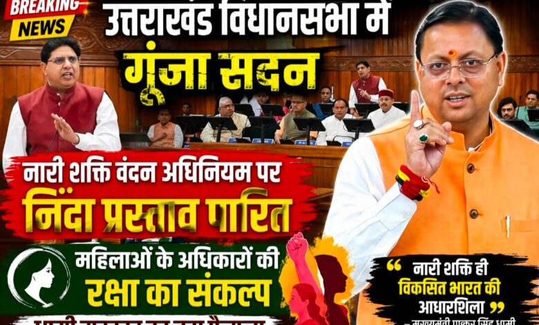 उत्तराखंड विधानसभा में नारी शक्ति वंदन अधिनियम पर गूंजा सदन, निंदा प्रस्ताव पारित,, 🟠 विपक्ष के विरोध के बीच महिलाओं के अधिकारों की रक्षा का लिया गया संकल्प,, 🟢 मुख्यमंत्री पुष्कर सिंह धामी ने कहा—नारी शक्ति ही विकसित भारत की आधारशिला