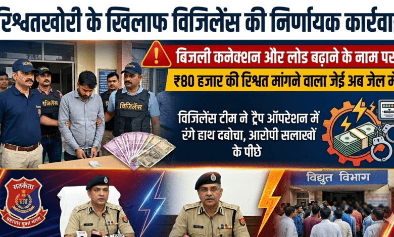 ऊर्जा विभाग में भ्रष्टाचार पर विजिलेंस का शिकंजा,, बिजली कनेक्शन और लोड बढ़ाने के नाम पर ₹80 हजार की रिश्वत मांगने वाला जेई गिरफ्तार,, विजिलेंस टीम ने ट्रैप ऑपरेशन में रंगे हाथ दबोचा, भ्रष्टाचार निवारण अधिनियम के तहत कार्रवाई